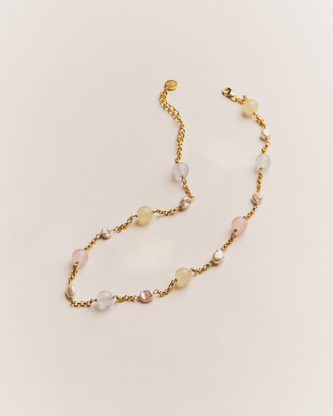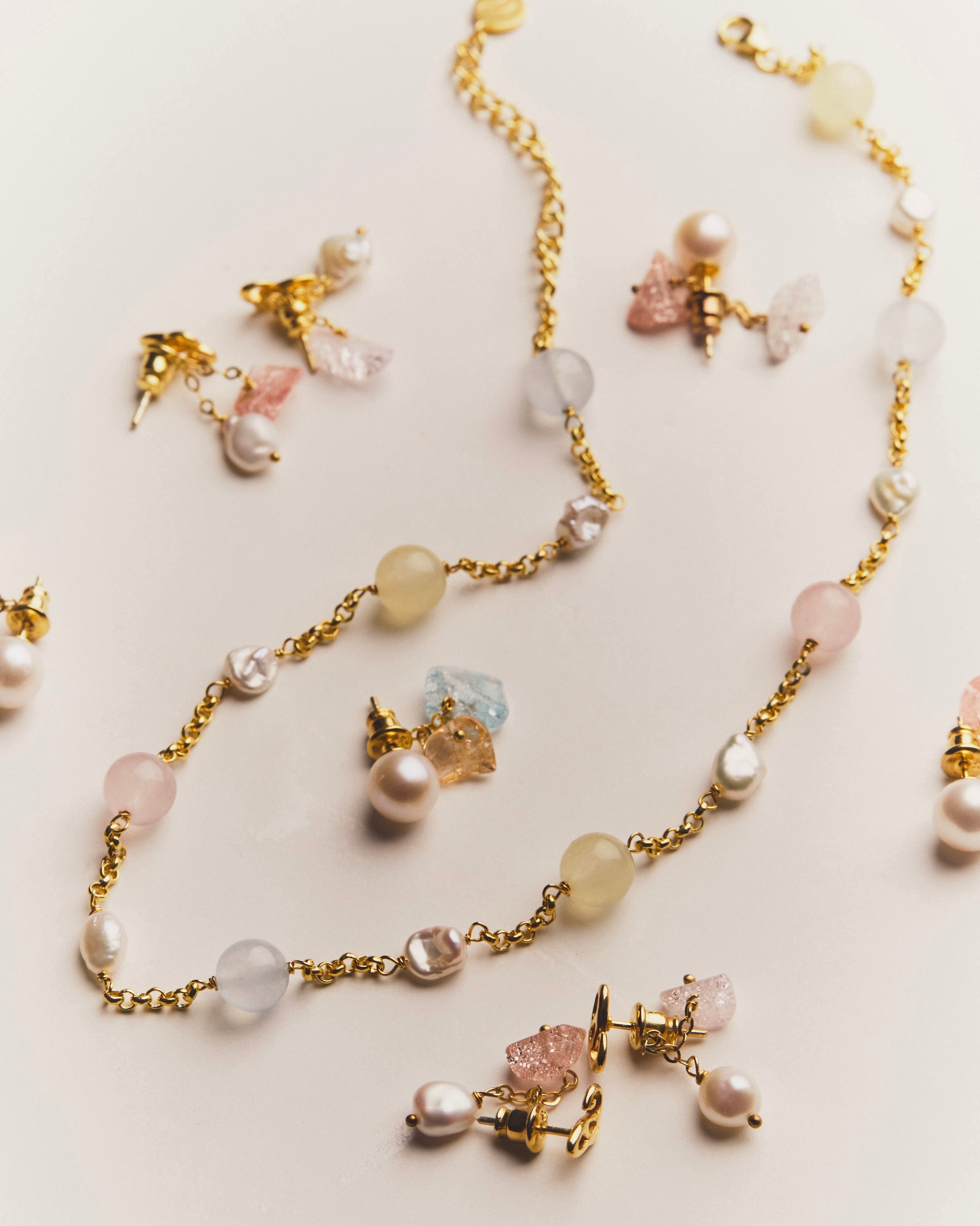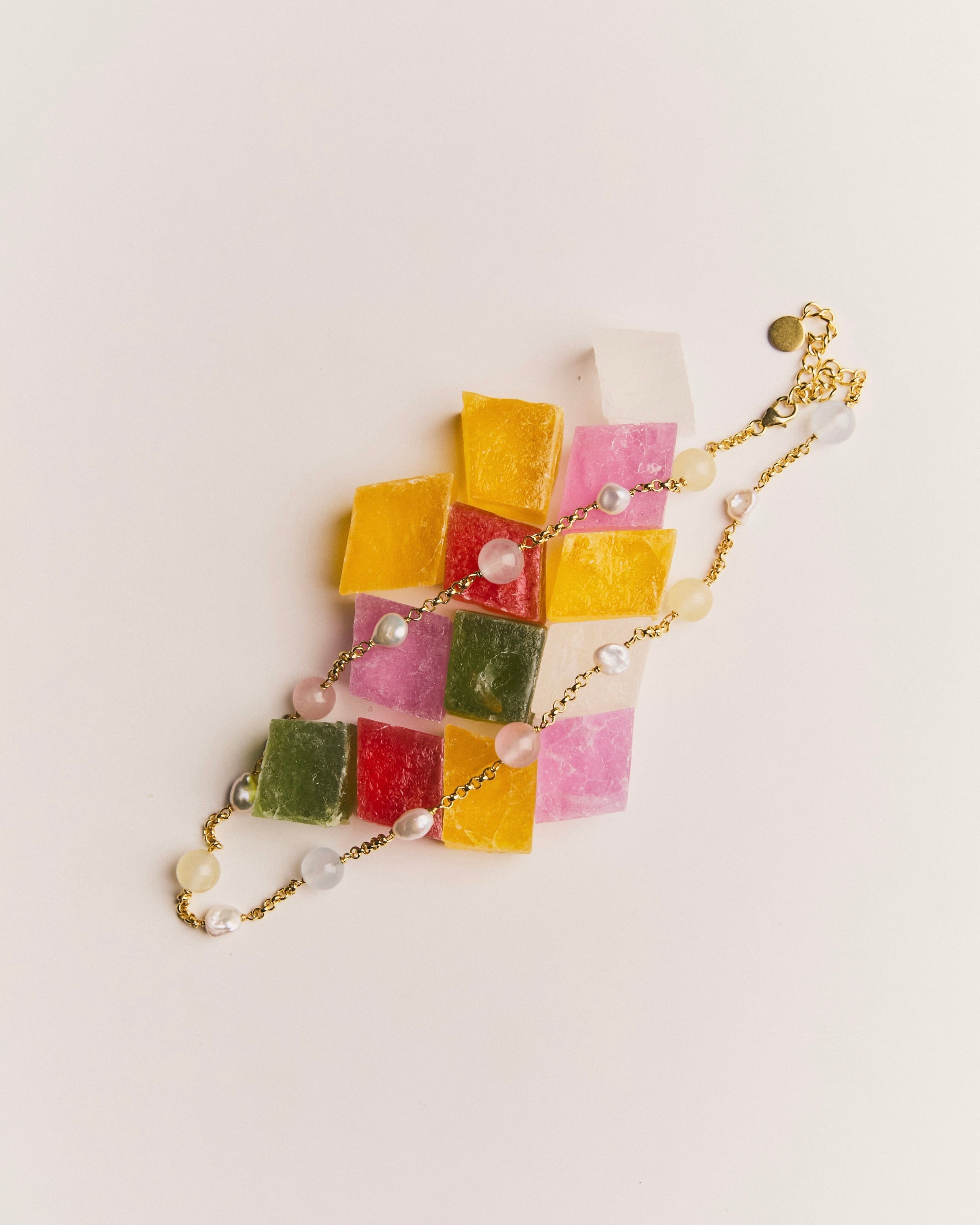 The rhythm created by the colorful quartz and pearls is somehow nostalgic yet new.
